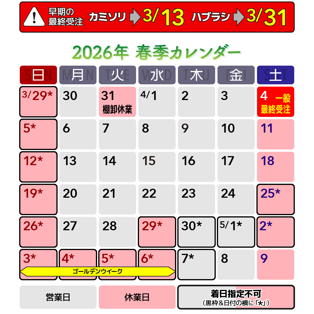 さて、ゴールデンウィークに伴いまして商品の受注締め切りや配達日を下記のスケジュールとさせていただくべくお伝えいたします。